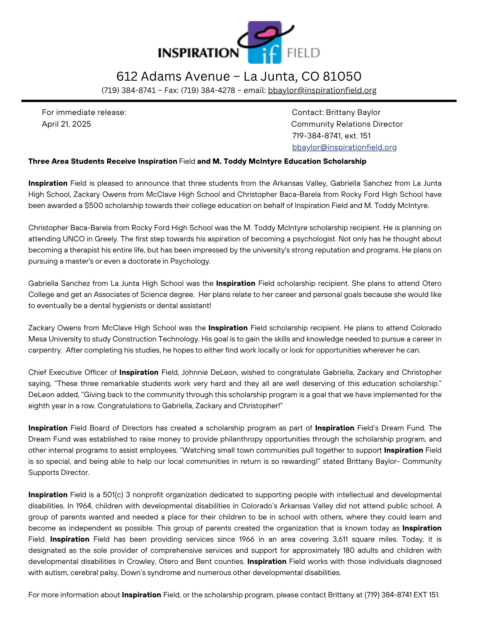 Contact Brittany Baylor at 719-384-8741, ext. 151 for more information.