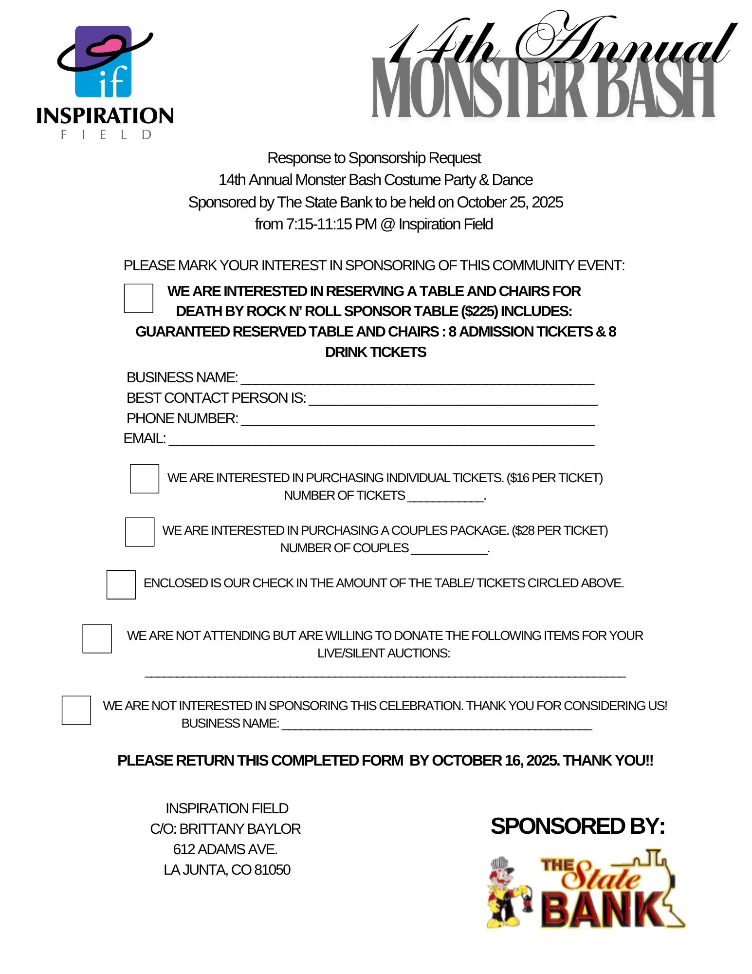 We’re proud to recognize La Junta State Bank as our Title Sponsor for this year’s Monster Bash: Death by ROCK N' ROLL! Your generous support helps make this incredible event possible, and we truly appreciate everything you do for our community.