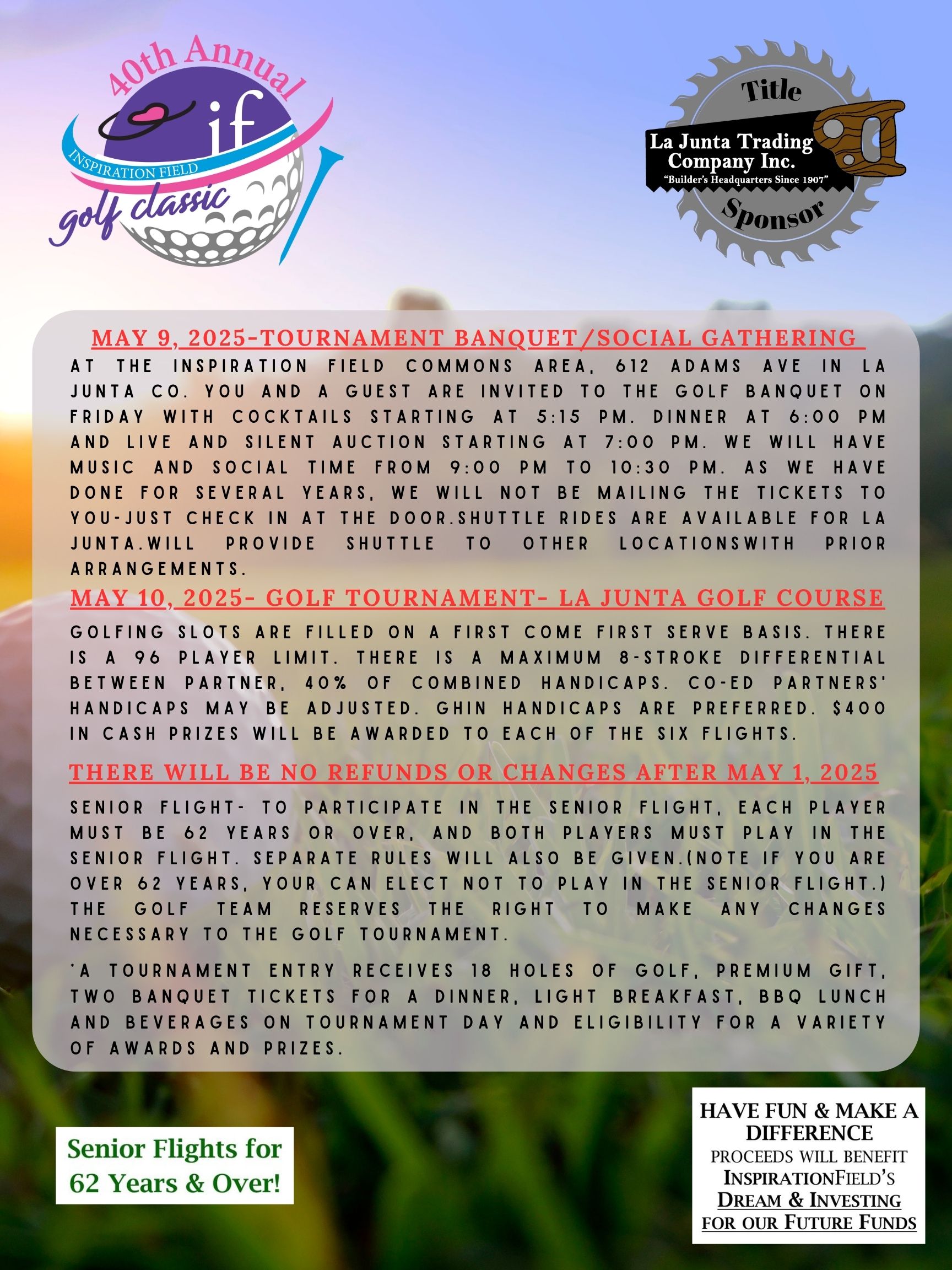Join Us for the 40th Annual Inspiration Field Golf Classic!Title Sponsor: La Junta Trading Company | May 9–10, 2025 Get ready for a weekend of fun, golf, and giving back! The 40th Annual Inspiration Field Golf Classic, proudly sponsored by La Junta Trading Company, is set for May 9–10, 2025.Friday, May 9: Tournament Banquet & Social Gathering Kick off the weekend at the Inspiration Field Commons Area, located at 612 Adams Avenue, La Junta, CO.Doors open: 5:15 p.m.Steak Dinner: 6:00 p.m.Live Music: 9:00 p.m.Enjoy an evening of food, entertainment, and both live and silent charity auctions.Saturday, May 10: Golf Tournament Head to the La Junta Municipal Golf Course for a 2-man scramble format tournament.Tee times: 7:30 a.m. & 1:00 p.m.Player cap: 96 total, first-come, first-served Handicap rules: Max 8-stroke differential between partners; 40% of combined handicaps used. GHIN handicaps preferred. Co-ed teams may receive adjusted handicaps.Prizes: $400 in cash prizes across six flight categories for 1st–3rd place. Senior Flights available for players 62+, with specific rules provided.Each Tournament Entry Includes:18 holes of golf Premium gift Two steak dinner banquet tickets, Light breakfast & BBQ lunch, Beverages on tournament day. Eligibility for awards and prize drawings. Reserve Your Spot Today! To register, print and complete the registration form and mail it to:Brittany Baylor, Community Relations Director Inspiration Field 612 Adams Avenue La Junta, CO 81050. A big thank-you to La Junta Trading Company for their generous support in making this event possible!